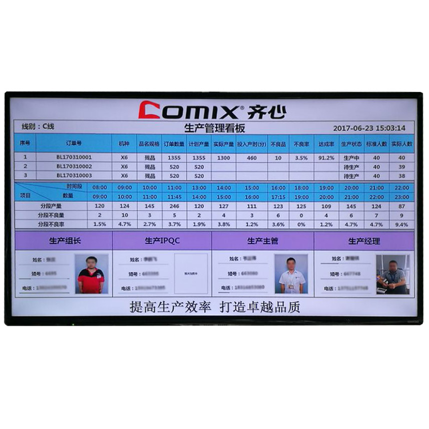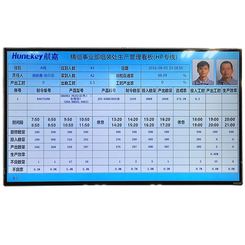 液晶電子看板,采用高分辨率,顯示內容豐富,色彩和布局可根據客戶喜好進行設計,同時可通過以太網/無線網絡將工廠內的所有電子看板進行集中管理,并且將實時的生產數據上傳到服務器,管理人員在辦公室就可以實時查看生產進度,返修率等數據。